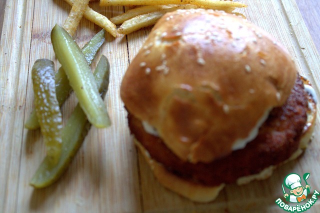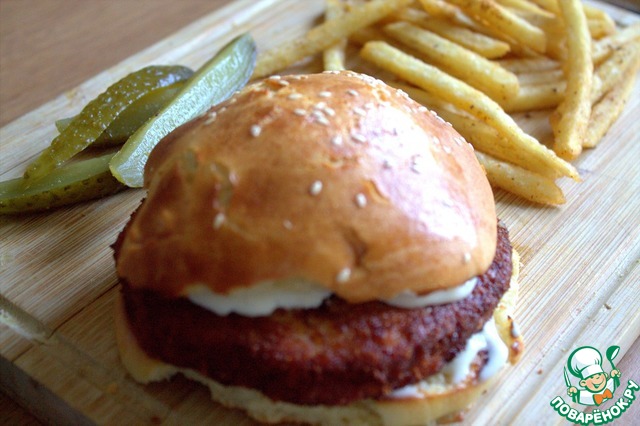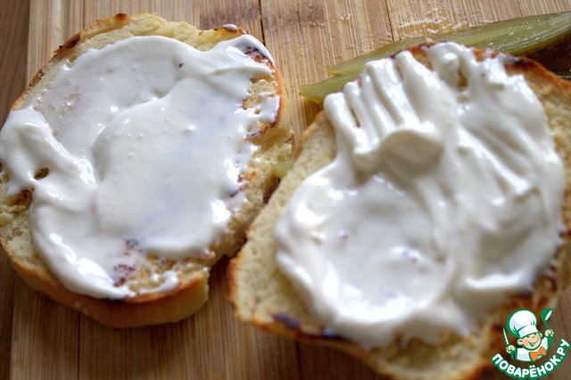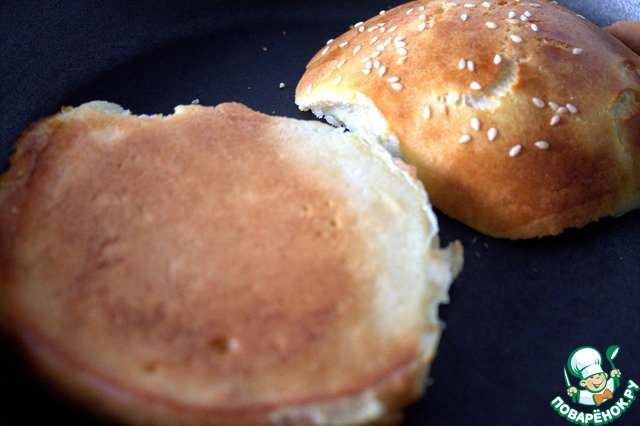 Для бургера разрезать булочку вдоль и подсушить на сухой сковороде срезом вниз.