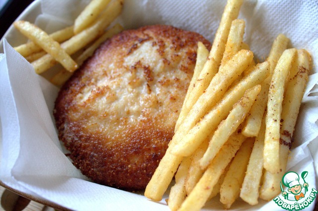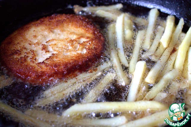 В сковороде с бортами разогреть растительное масло и обжарить котлету для бургера и рядом порцию картофеля.