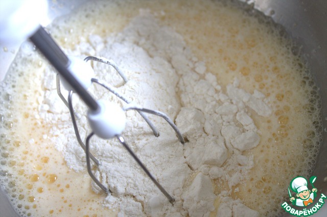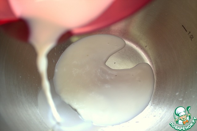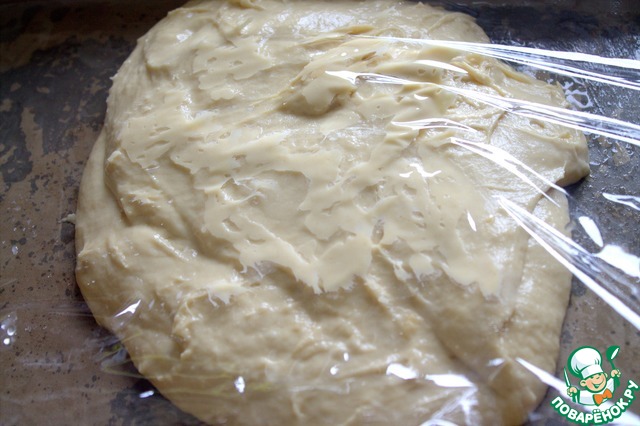 Убираем в холодильник на 1,5 часа, потом снимаем плёнку. Тесто должно увеличиться.