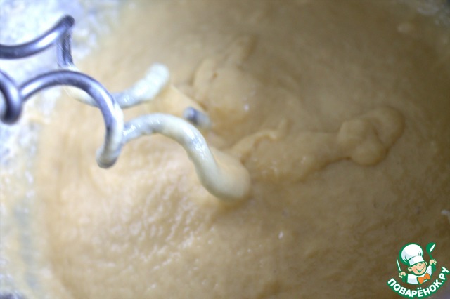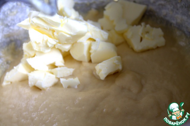 Теперь вводим кубики сливочного масла комнатной температуры. Мешаем, пока тесто не отойдёт от стенок чаши довольно долго.