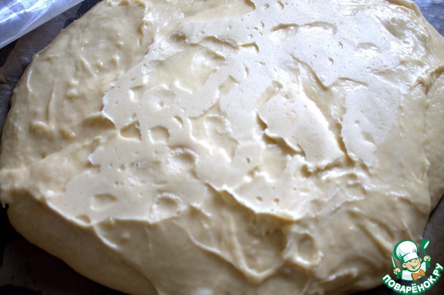 Переносим масляной рукой подвижное тесто на смазанное маслом дно формы. У меня многоразовый коврик для выпечки. Накрываем плёнкой.