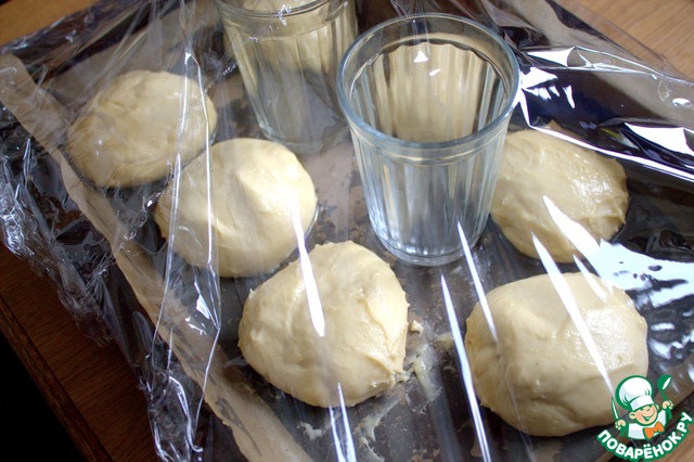 Делим на порции, накрываем плёнкой так, чтобы не касалась теста. Оставляем на столе подняться тесту.