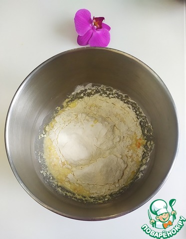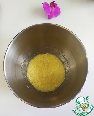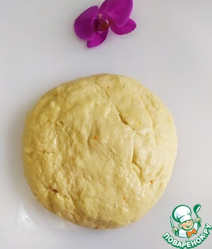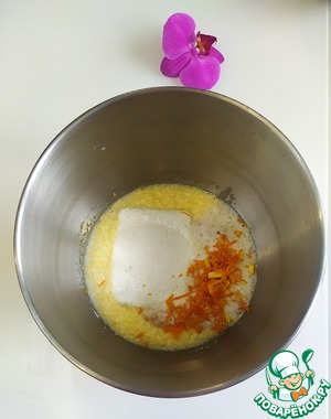 Добавить опару, творог (200 г.), соль, сахар (80 г.), цедру апельсина. Взбить миксером.