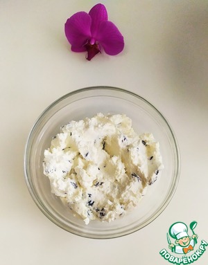 Для начинки в чаше смешать творог (400 г.), изюм и сахар (50 г).