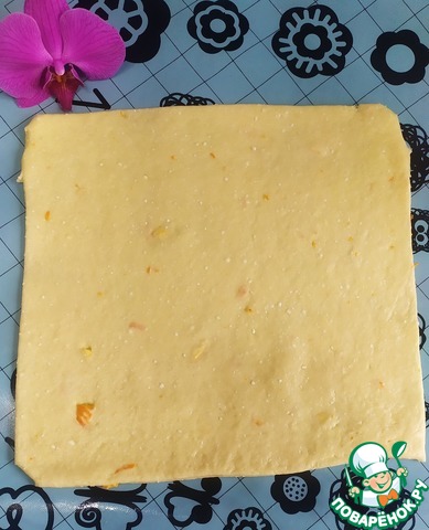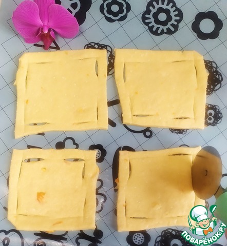 Наше тесто разделить на 4 части. Каждую часть раскатать в квадрат. Края можно обрезать чтобы получился ровный квадрат.