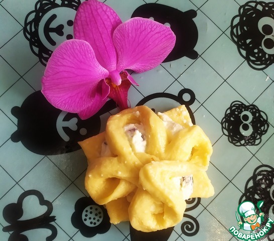 Далее скрепить вторые два края. Получится цветочек, как на фото. Остальные цветочки делаем по указанной технологии. Противень застелить силиконовым ковриком. Выложить булочки. Оставить на 10-15 минут. Смазать яйцом. Поставить в духовку и выпекать при температуре 185 градусов 20-25 минут.