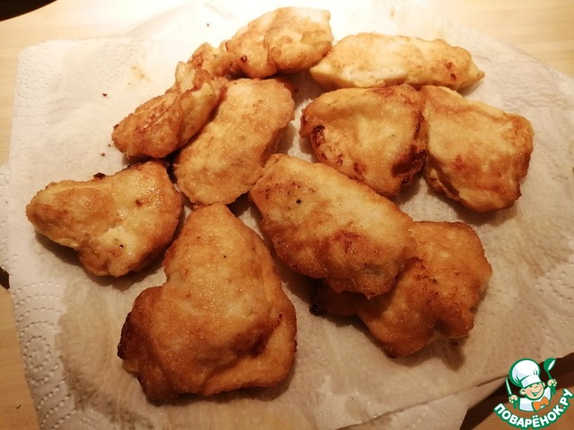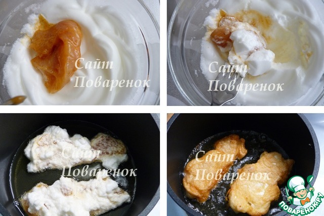 Каждый кусочек окунуть во взбитый белок. Белковый кляр получается как облачко.