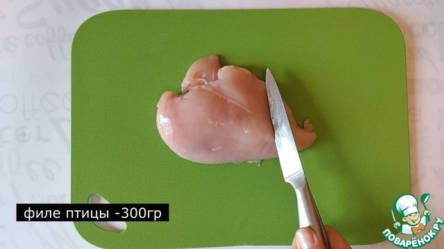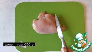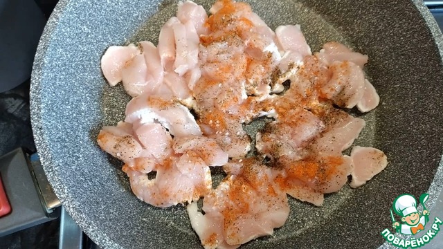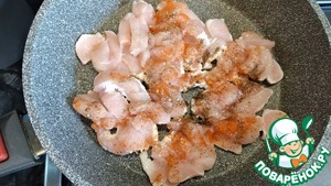 1. Режем филе птицы на мелкие кусочки и добавляем специи : соль морская, паприка сладкая и перец черный молотый.