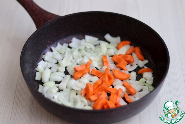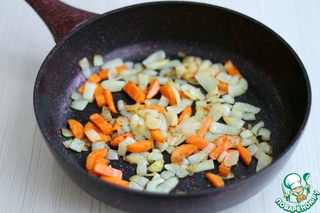 Лук слегка протушить. Далее нарезать морковь (1 шт.) не крупными кусочками. Добавить морковь в сковороду с тушеным луком.