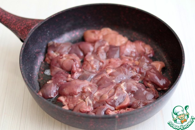 На сковороду, где обжаривался бекон, добавить подготовленную для обжарки/тушения куриную печень. Предварительно печень промыть, удалить пленочки, излишки жира, печень нарезать не крупными кусочками. Тушить печень на среднем огне до готовности, добавить 1 ст. ложку коньяка, мускатный орех (1/3 ч. ложки), добавить соль по вкусу.