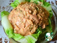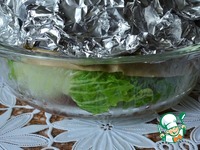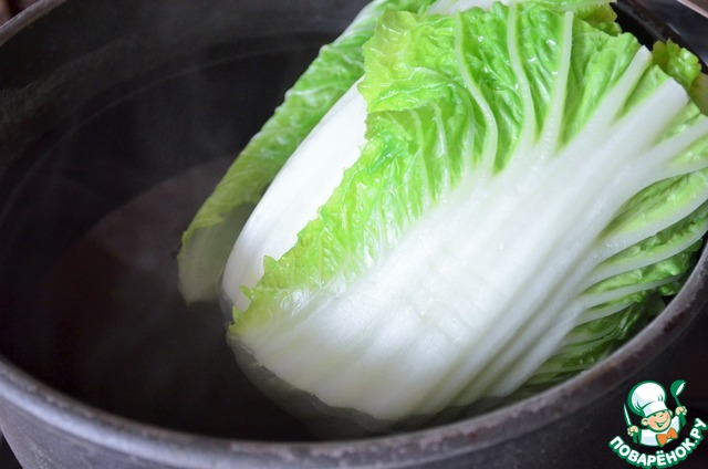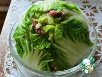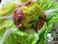 Вот так легко и красиво раскрывается пекинская капуста после обваривания. Капусту поместить в глубокую огнеупорную форму, чуть больше самой капусты, 14 см.. Слегка посолить. |