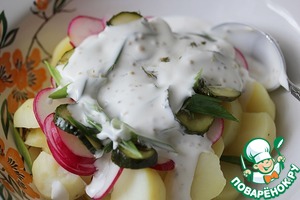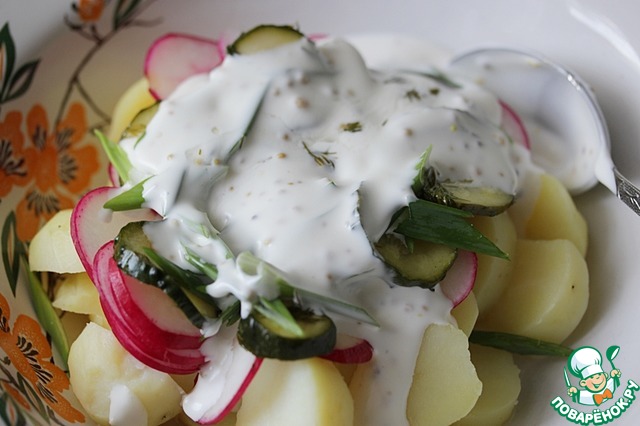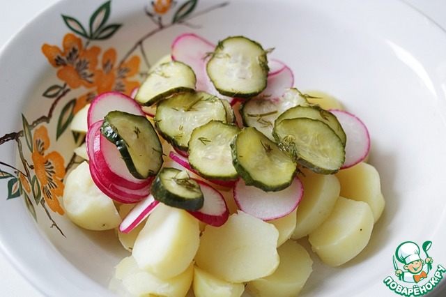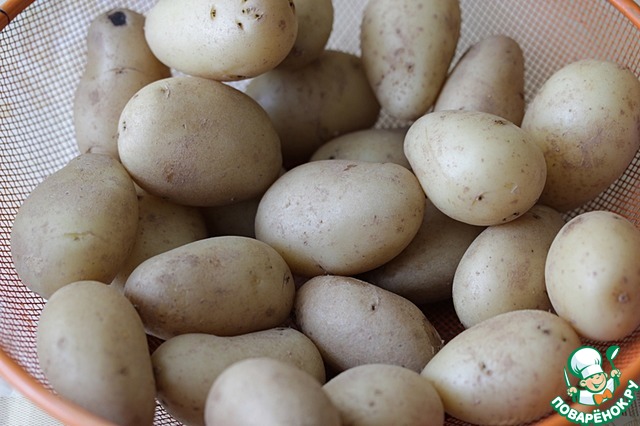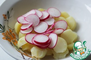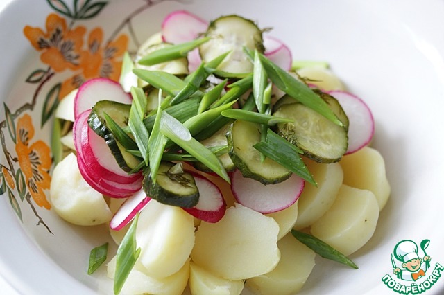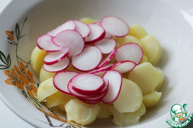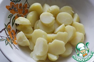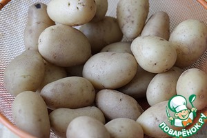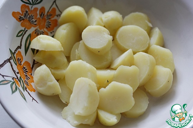Молодой картофель вымыть, сварить в мундире и охладить.