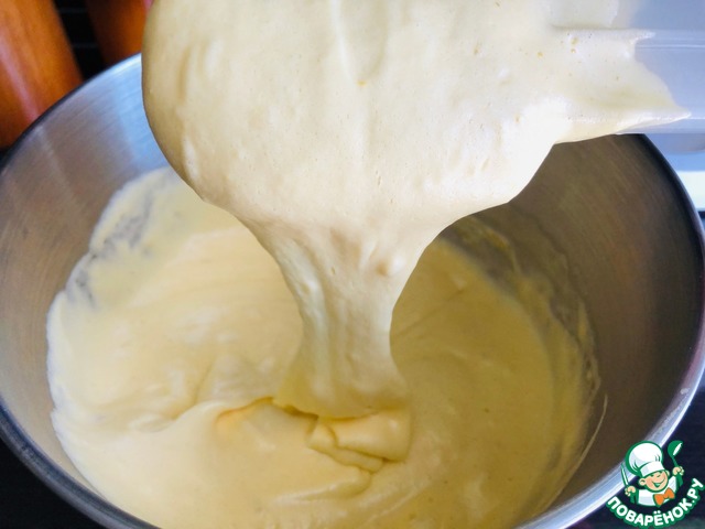 2. Просеянную муку смешиваем с разрыхлителем и ванилином, частями добавляем к взбитым яйцам, аккуратно перемешиваем венчиком или силиконовой лопаткой массу сверху вниз. Тесто должно получиться воздушным. Стараемся, чтобы тесто не опало.