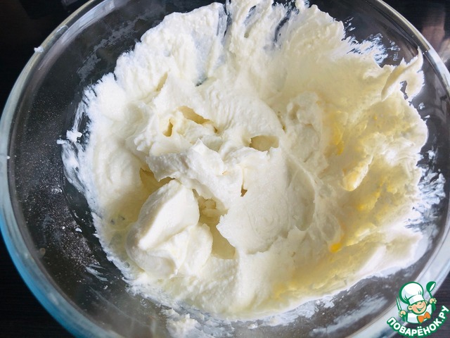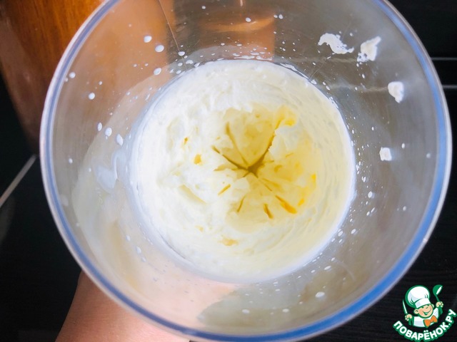 7. Готовим крем. Творог, творожный сыр, сахарную пудру, ванильный сахар при помощи блендера превращаем в однородную массу.