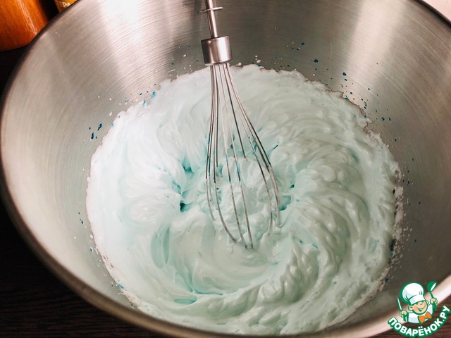 -Теперь взбиваем нашу меренгу и добавляем краситель. Запаситесь терпением — потребуется примерно от 7 до 10 минут (зависит от мощности миксера). -