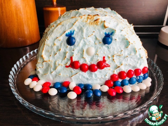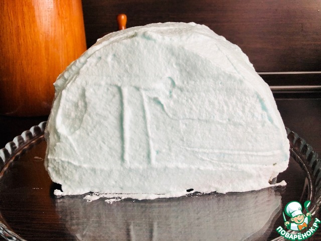 Покрываем торт меренгой. Затем при помощи кондитерского шпателя или ножа делаем на поверхности меренге неровности. -