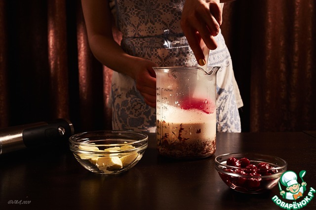 Туда же добавить 50 гр вишни из коньяка. Так же пробить.