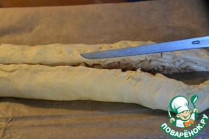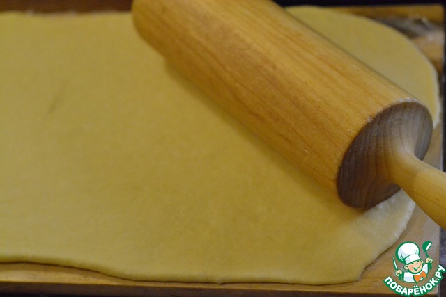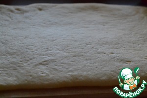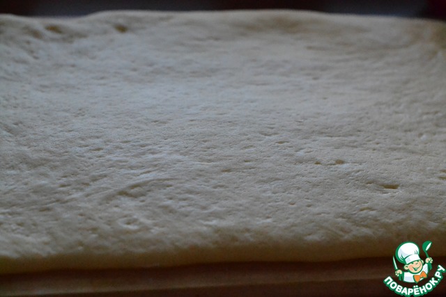 Подошедшее тесто раскатать на доске в прямоугольник, толщиной 4мм.