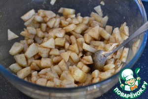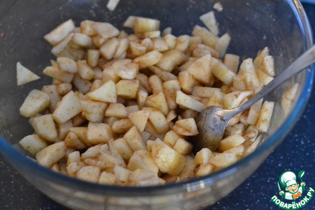 Бисквитное печение нарезать на кусочки и добавить к яблокам и слегка перемешать. Оставить на 10 минут. -
