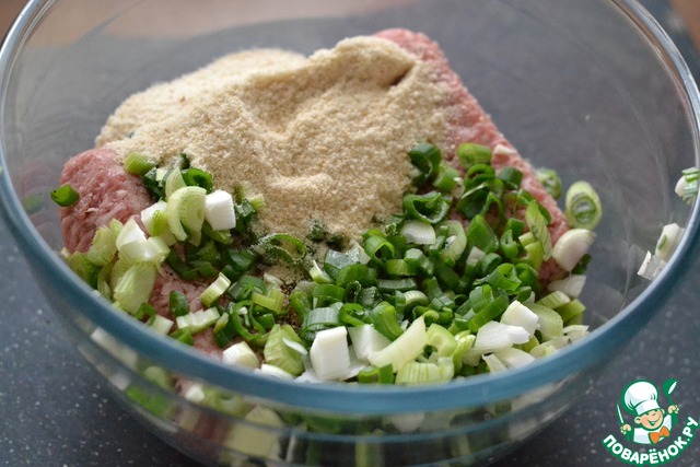 В миске смешать фарш, мелконарезанный зеленый лук и чеснок, панировочные сухари, половину соли и перца. Перемешать.