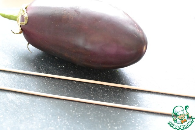 Выложить половинку баклажана разрезом вниз на доску. С двух сторон баклажана выложить палочки.