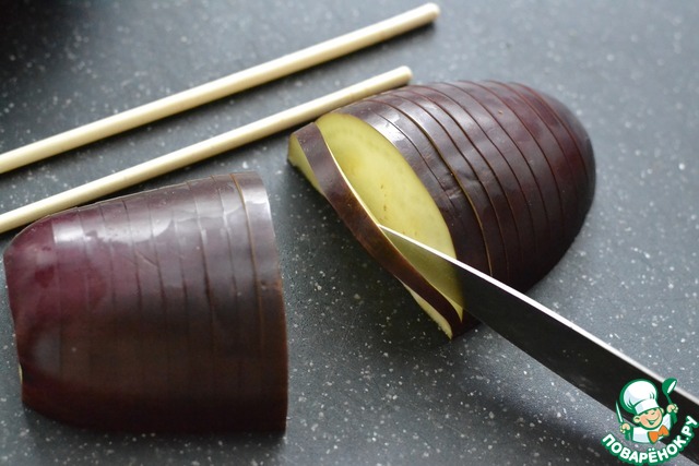 Нарезать баклажан, недорезая до конца. Палочки нам помогут, они не пустят нож до конца. -