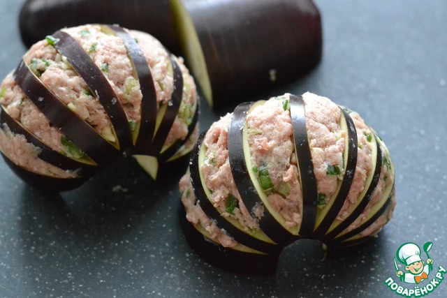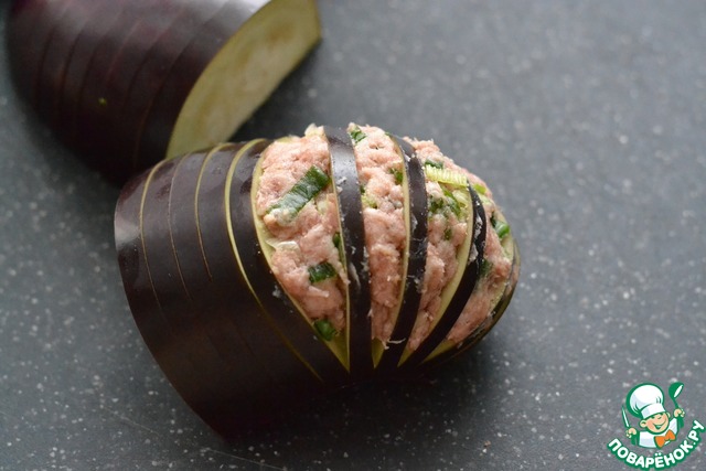 Аккуратно, раздвигая каждый разрез баклажана, заполнить его фаршем. Обязательно каждый разрез!