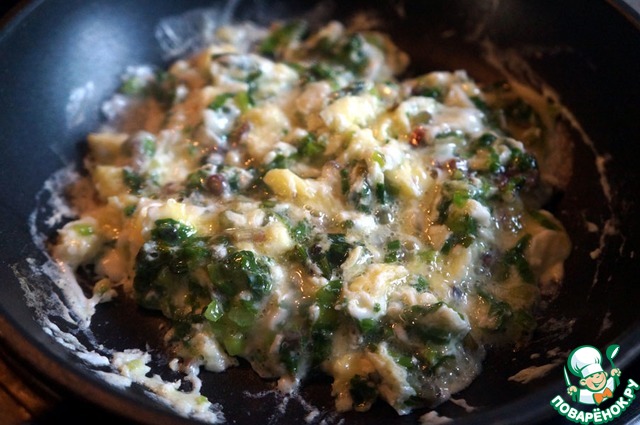 Выложить черемшу, жарить на среднем огне до мягкости. Затем вбить яйца, перемешать, посолить и жарить, пока яичница не загустеет. Немного остудить.