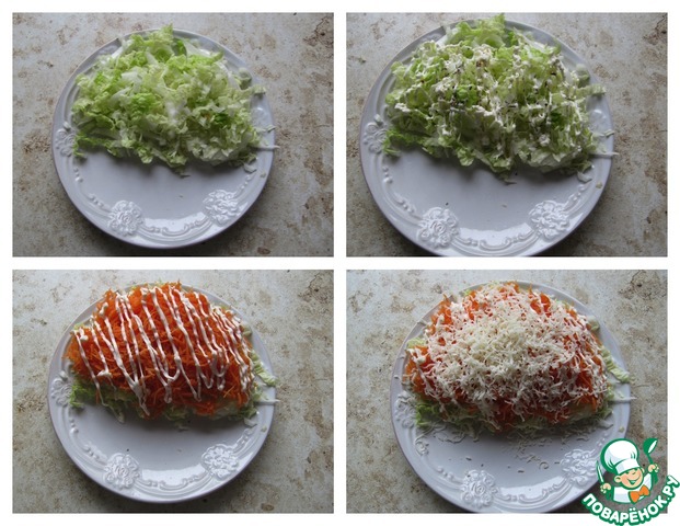 Для приготовления салата листья пекинской капусты помыть, нарезать соломкой, перемешать с чесноком (количество по вкусу), сверху слегка посыпать солью и травами из мельнички. Нанести тончайшую сетку из майонеза, сверху выложить слой натертой на средней терке моркови, тончайшая сетка из майонеза, сверху слой натертого сыра, по желанию добавить тонкие дольки помидора. В этом салате обязателен чеснок и майонез, без этих ингредиентов вкус теряется!
