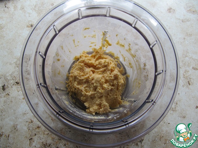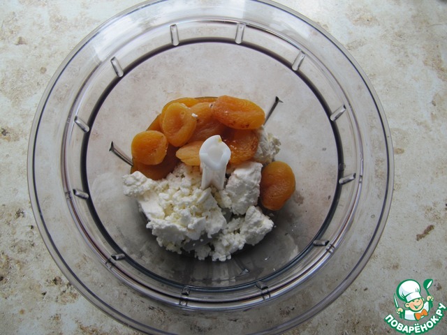 Для приготовления творожной прослойки творог хорошего качества, курагу, яичный желток (или мелкое яйцо), ванильный сахар измельчить блендером до однородного кремоообразного состояния (если не использовать курагу - добавить дополнительно творог и сахар по вкусу!).