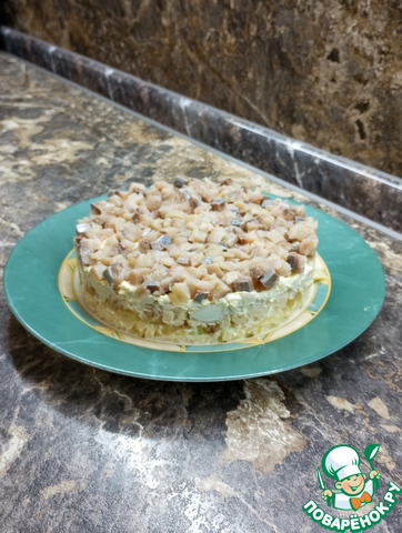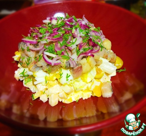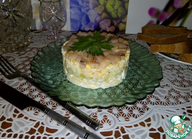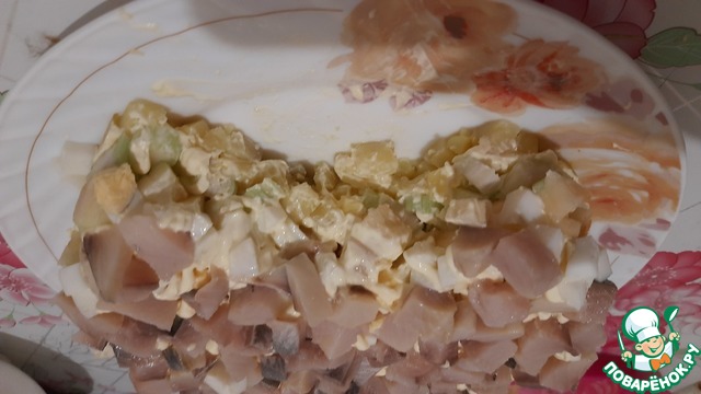 Филе сельди и сельдерей нарезать на кубики, майонез не добавлять.