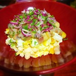 Картофель очистить, также нарезать на мелкие кубики и смешать с небольшим количеством майонеза. -
