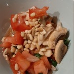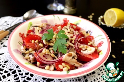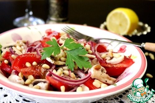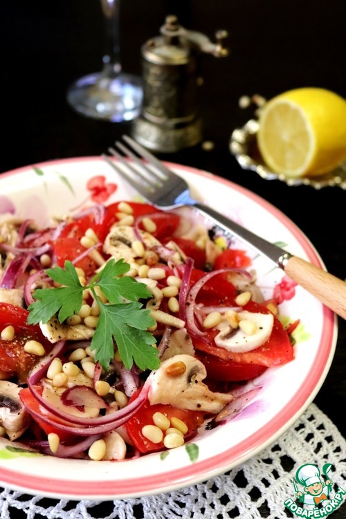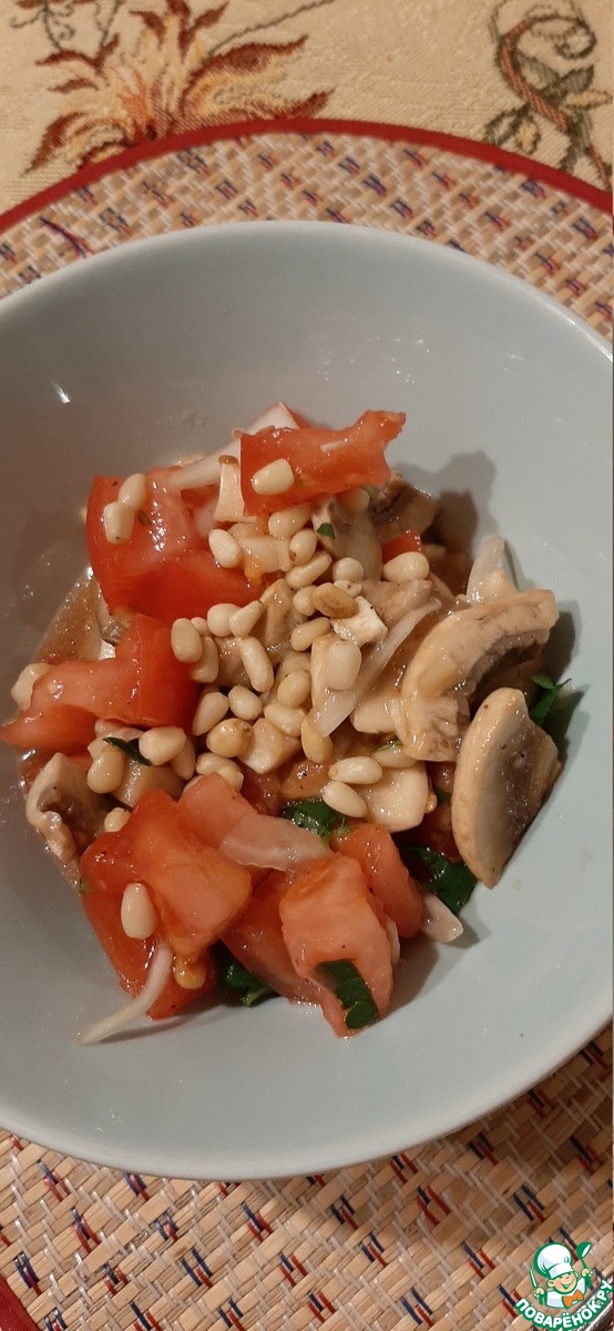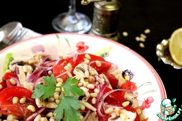Вкусный и лёгкий салат из помидоров и шампиньонов с кедровым орешками. В салате присутствуют свежие шампиньоны. Не бойтесь их есть сырыми, это одни из немногих грибов, которые употребляют таковыми. В Италии и Франции свежие шампиньоны часто используются в кулинарии, а чем мы хуже!? Такой салат я часто готовлю на посиделки с подружками. Попробуйте и вы.