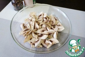 Свежие шампиньоны протереть салфеткой, убрать загрязнения, можно снять верхнюю шкурку со шляпки. Нарезать их дольками. Посолить, посыпать сахаром, перцем по вкусу. Сбрызнуть соком лимона. Перемешать.