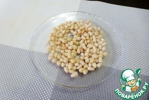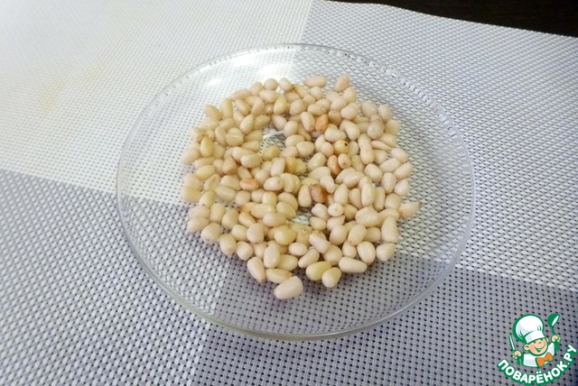 Кедровые орехи подсушить в микроволновке или на сухой сковороде до лёгкой желтизны. Следите, чтобы не подгорели!