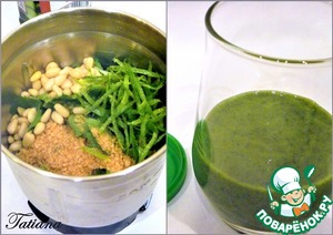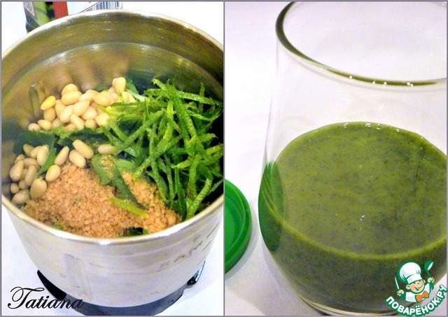 Пучок мяты промойте, просушите. Для соуса понадобятся только листочки. Лайм хорошо вымойте, снимите цедру, выжмите сок. В стакан-измельчитель выложите цедру+мятные листья+кедровые орехи+тростниковый сахар, влейте лаймовый сок и оливковое масло. Измельчите все ингр. в однородную смесь. Перелейте соус в баночку, уберите в холодильник.