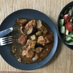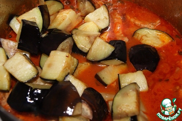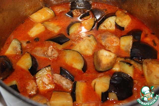 За 10 минут до конца готовки мяса, добавить к нему баклажаны, при необходимости подсолить соус.