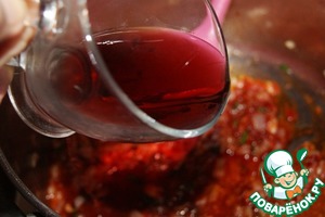 Влить вино. тушить 3-4 минуты, чтобы ушли винные пары.