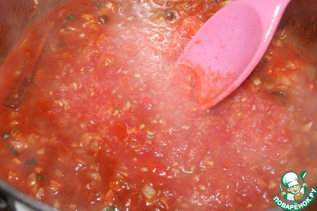 Затем добавить натертые на терку помидоры и воду. Перемешать, довести до кипения, убрать корицу, добавить перец кайен и убавить огонь.
