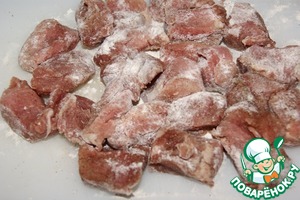 Мясо нарезать небольшими кусочками, такими же кусочками потом нарезать и баклажаны. -