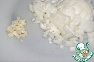 В кастрюле с толстым дном (в которой будем готовить наше блюдо) нагреть масло и обжарить нарезанные лук и чеснок до прозрачности.