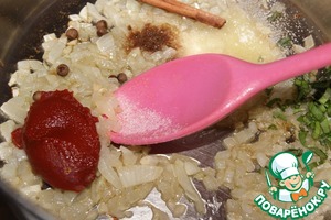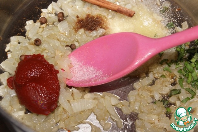 Добавить в него душистый перец, тмин, сахар, томатную пасту, соль, палочку корицы и все вместе протушить 2- минуты.