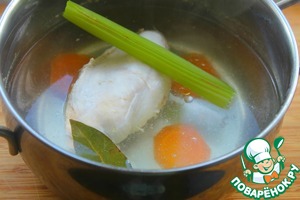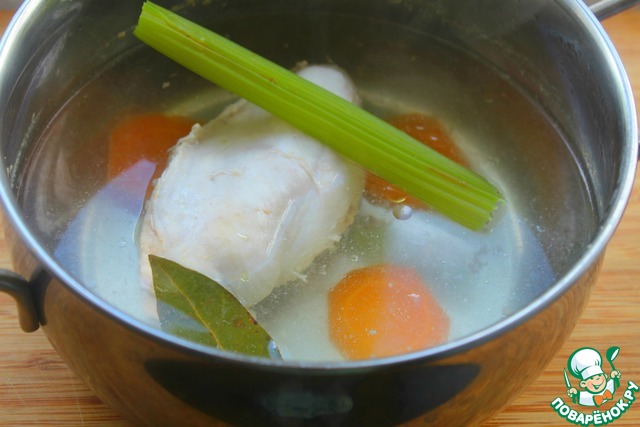Налить в сотейник 750 мл воды добавить черешок сельдерея морковь лавровый лист соль по вкусу.