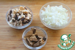 Нарезать лук, шампиньоны, смолоть сухие грибы в порошок.