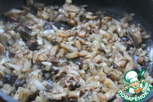 На растительном масле обжариваем лук пару минут, затем добавляем шампиньоны и посыпаем грибным порошком.