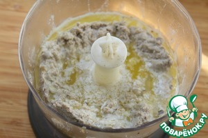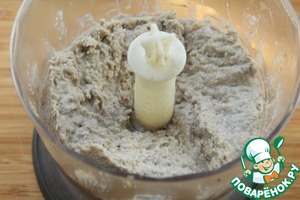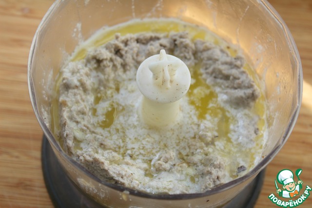 В блендер положить вареное порезанное куриное филе, лук с грибами, горчицу, добавить бульон из-под филе (я добавила 70 мл) - хорошо пробить.
