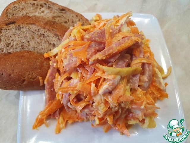 Яичные блинчики и колбасу нарезаю соломкой. Морковь натираю на крупной тёрке.