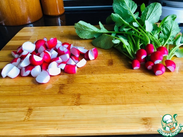 3. Часть молодого редиса оставляем с ботвой (если редис крупный его нужно разрезать вместе с ботвой пополам), а остальную часть нарезаем крупными брусочками.