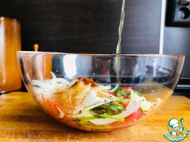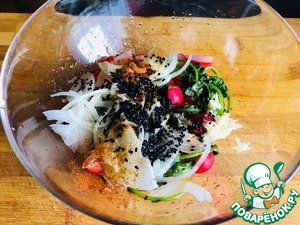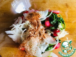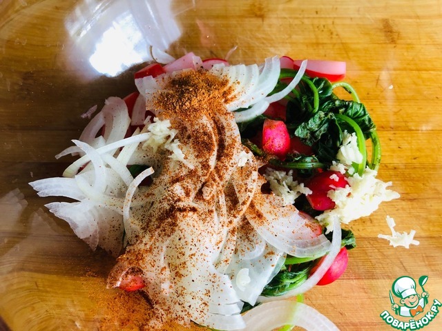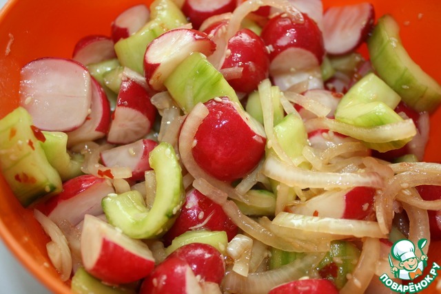 6. Нарезаем полукольцами репчатый лук и добавляем в миску к редису. Чеснок пропускаем через пресс. Добавляем чёрный молотый перец, красный жгучий перец, кунжутное масло.