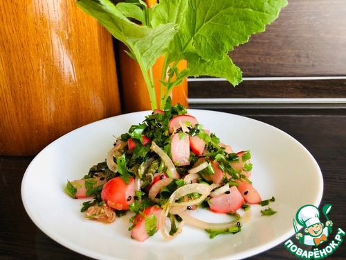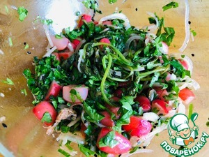 11. Зелень добавляем к салату и перемешиваем. Убираем салат в холодильник минимум на 1 час. для того чтобы салат пропитался.